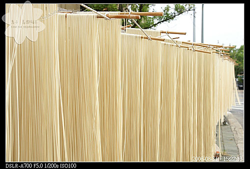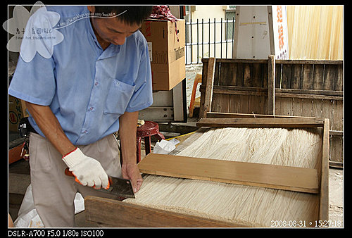 就在經過泉珍麵線時,正好看見老闆忙著收下今天曬完的麵線,